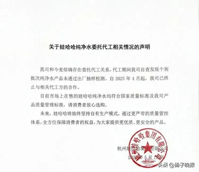 彼时,娃哈哈发布关于娃哈哈纯净水委托代工相关情况的声明称,我司和今麦郎确存在委托代工关系,代工期间我司自查发现个别批次纯净水产品未通过出厂抽样检测。自2025年4月起,我司已终止与相关代工方的合作。